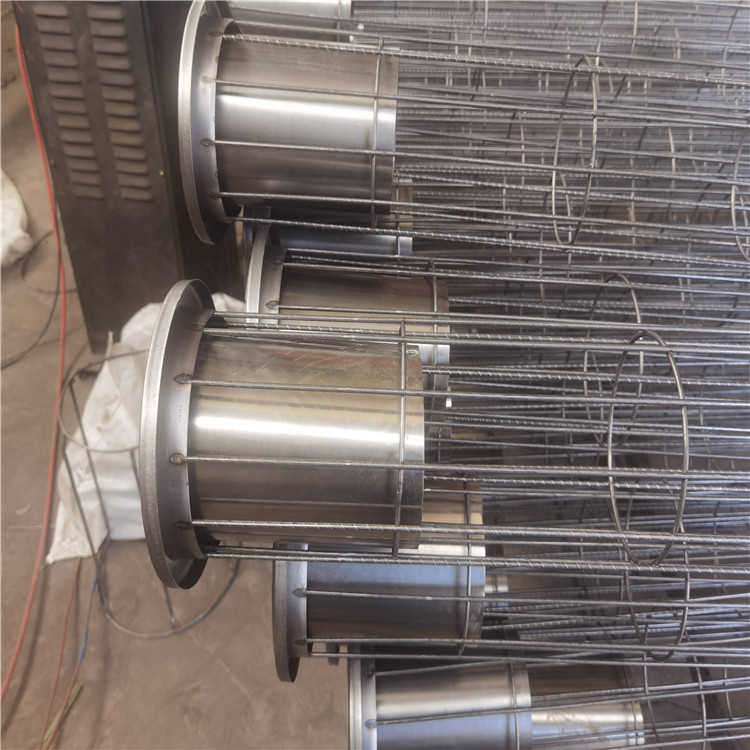 袋籠的筋選用Q235炭素鋼絲。環(huán)筋直徑不小于4.0mm,豎筋直徑不小于3.5mm,豎筋數(shù)量14根;環(huán)筋間距不得大于200mm。單根袋籠豎向筋不允許拼接。