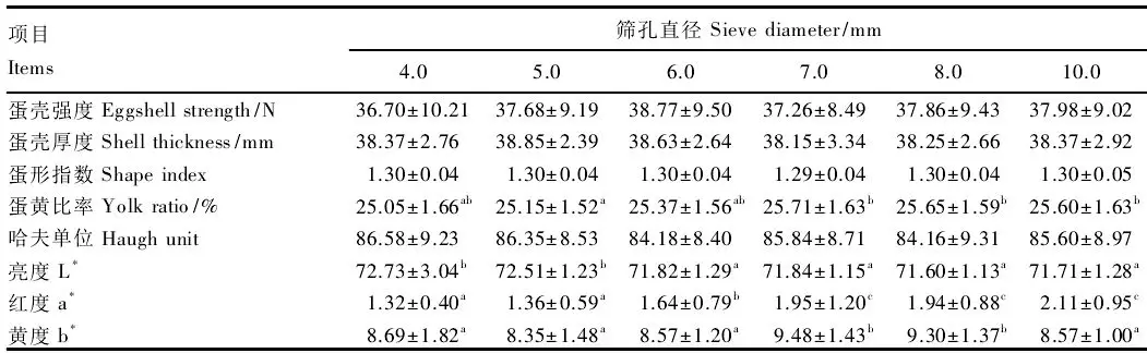7.0 mm 篩孔直徑組蛋黃比率顯著大于 5.0mm 篩孔直徑組( P < 0.05)。