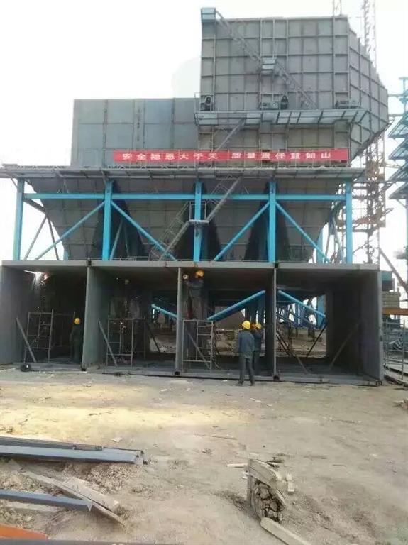 鍋爐布袋除塵器的氣體凈化方式為外濾式,含塵氣體由導(dǎo)流管進(jìn)入各單元過(guò)濾室并通過(guò)進(jìn)風(fēng)閥進(jìn)入設(shè)置于除塵器灰斗上側(cè)的煙氣導(dǎo)流裝置;氣流通過(guò)阻流加導(dǎo)流型氣流分布裝置的適當(dāng)導(dǎo)流和自然流向分布,從下部均勻進(jìn)入袋室,整個(gè)過(guò)濾室內(nèi)氣流分布均勻;含塵氣體中的顆粒粉塵在進(jìn)風(fēng)道內(nèi)通過(guò)自然沉降分離后直接落入灰斗,其余粉塵在煙氣導(dǎo)流裝置的引導(dǎo)下,隨氣流進(jìn)入中箱體過(guò)濾區(qū),吸附在濾袋外表面。鍋爐布袋除塵器過(guò)濾后的潔凈氣體透過(guò)濾袋經(jīng)上箱、排風(fēng)管排出。因采用下部進(jìn)風(fēng)的方式,濾袋底部與進(jìn)風(fēng)口留有相當(dāng)?shù)母叨龋业臍饬魃仙俣群艿?,基本杜絕了二次揚(yáng)塵的產(chǎn)生。