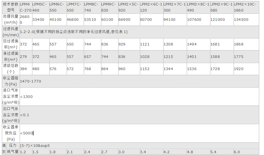 3、LPM氣箱脈沖袋式收塵器技術參數(shù):