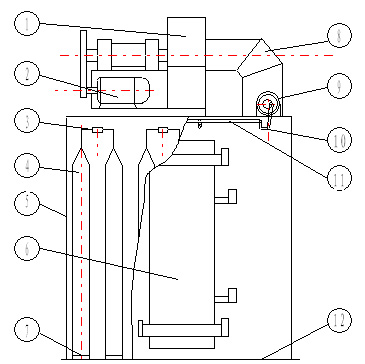 (3)搖動(dòng)機(jī)構(gòu)包括:⑨搖動(dòng)用減速電機(jī)⑩曲桿,搖動(dòng)連桿③搖動(dòng)軸(或稱(chēng)濾袋懸掛軸);
