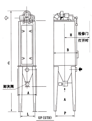 STD:安裝形式為Standand標(biāo)準(zhǔn)型,帶灰斗和支架,灰斗下接卸料器,翻板閥等卸灰裝置。進(jìn)風(fēng)口方向可按用戶要求朝向四方。