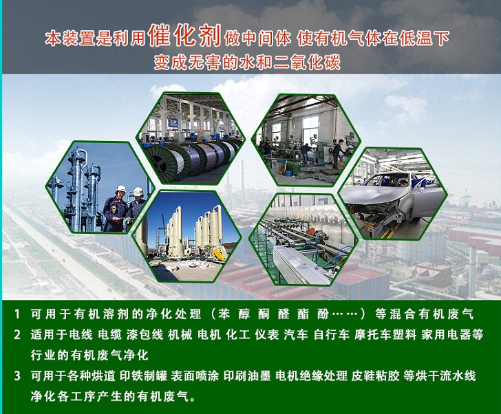 有機廢氣治理催化燃燒設備裝置應用于家具行業(yè)有機廢氣治理、石油化工、煤化工、人造革、紡織印染、油漆涂料有機廢氣治理、橡膠廢氣治理設備、塑料、制鞋、制藥、電子、化纖、釀造等行業(yè)。可處理的有機溶劑包括苯類、酮類、脂類、醇類、醛類、醚類、烷類和其混合類。