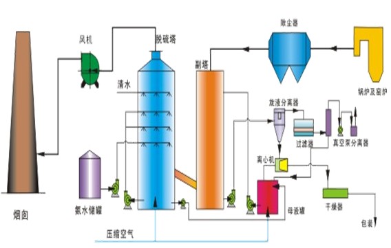 氨是一種良好的堿性吸收劑。利用氨的這一特性,以水溶液中的NH3和SO2反應(yīng)為基礎(chǔ)用氨水將廢氣中的SO2脫除,生成亞硫酸氫銨和亞硫酸銨溶液,經(jīng)氧化后得到硫酸銨溶液,進(jìn)而干燥得到硫胺產(chǎn)品。