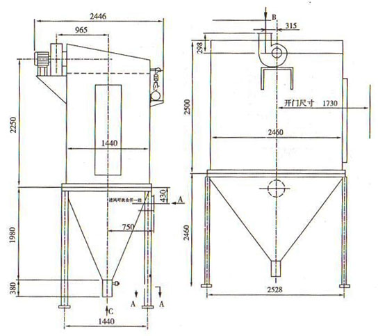 本除塵器由上、中、下箱體、排灰裝置及噴吹清灰系統(tǒng)五部分組成。上箱體包括可掀起的頂蓋和出風(fēng)口。中箱體內(nèi)有花板、濾袋組件。下箱體有灰斗,進(jìn)風(fēng)口及檢修門(mén)。排灰裝置為回轉(zhuǎn)卸料閥。噴吹清灰系統(tǒng)由脈沖控制儀,電磁氣閥,噴吹管及氣包組成。